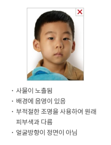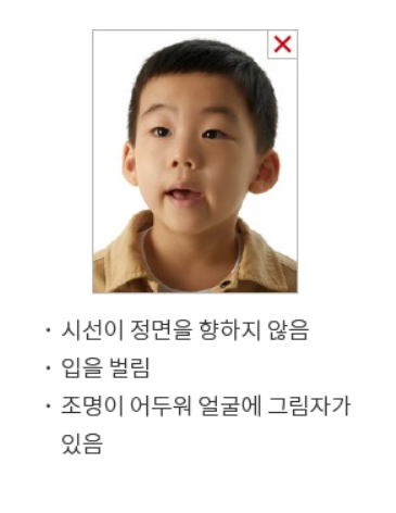 여권발급 신청일 전 6개월 이내에 모자 등을 쓰지 않고 촬영한 천연색 상반신 정면사진 제출해야 하며, 모든 기준은 성인과 동일합니다. 장난감 등 사물이나 보호자가 노출되지 않아야 하고 입을 다물고 촬영하기 어려운 신생아 및 유아(36개월 이하)의 경우에는 입을 조금 벌리는 것은 가능합니다.